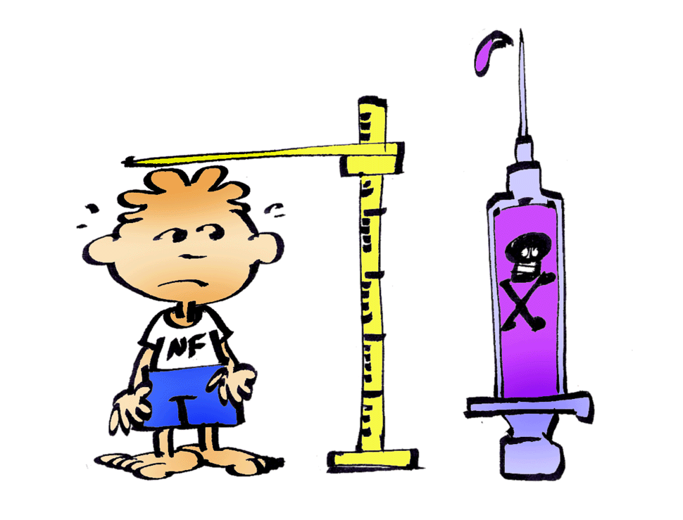 Não há necessidade de reposição de hormônio do crescimento nas pessoas com baixa estatura na NF1. Primeiro, porque apesar de não sabermos a causa exata da baixa estatura de cerca de metade das crianças com NF1, sabemos que não é a redução do hormônio do crescimento que provoca o problema. Segundo, porque temos a suspeita de que o tratamento com hormônio do crescimento em pessoas com NF1 pode desencadear ou acelerar o crescimento dos neurofibromas.