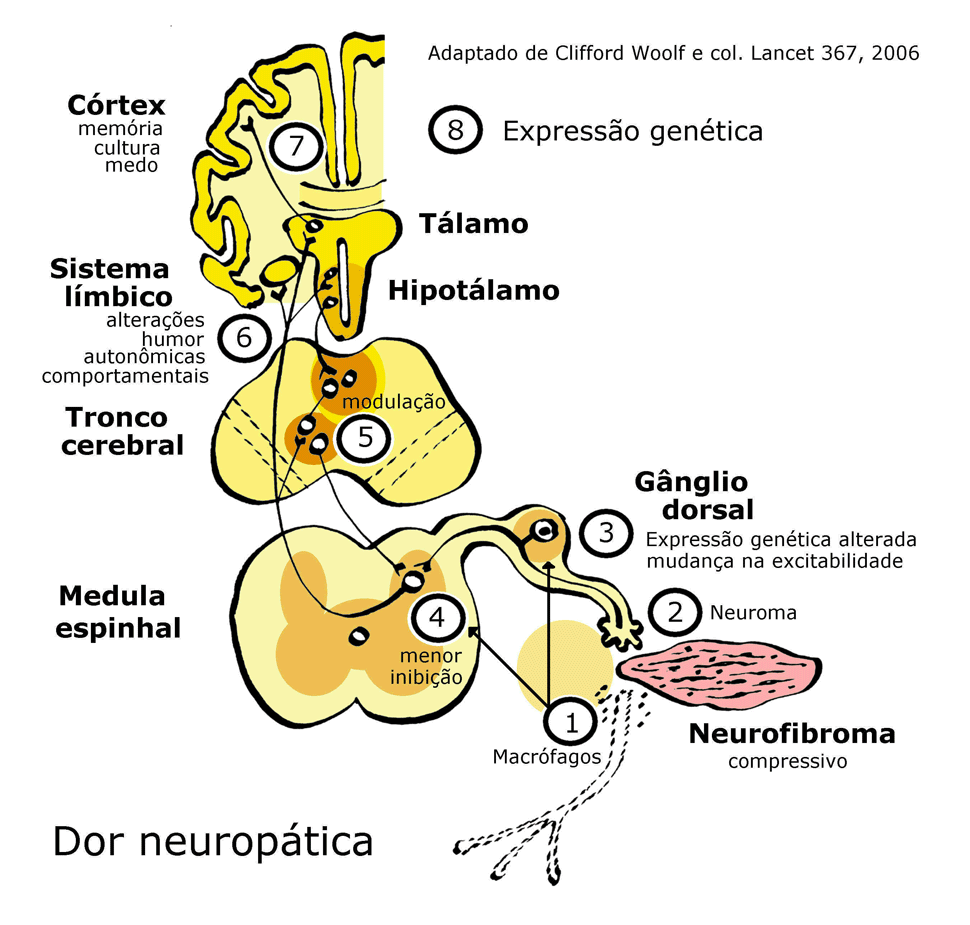 - Compressão mecânica, por exemplo, um neurofibroma comprimindo o nervo, causando irritação ou mesmo amputando o nervo. Por isso, a remoção cirúrgica de neurofibromas compressivos pode aliviar algumas formas de dor neuropática.