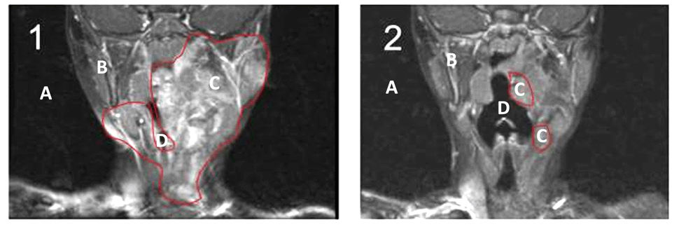 Sei que nem todos entendem imagens radiológicas, mas as figuras abaixo são ressonâncias magnéticas de parte da cabeça e do pescoço, vistas de frente e que foram realizadas antes (1) e depois (2) do tratamento com imatinibe durante 3 meses.