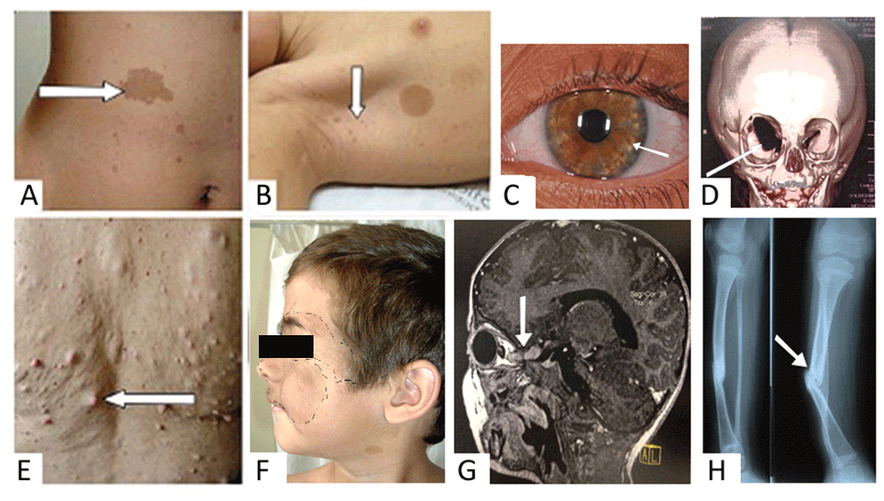 Apesar de ser uma doença que afeta predominantemente a pele e o sistema nervoso central e periférico, a NF1 pode atingir qualquer um dos demais órgãos. As “lesões” cutâneas mais comuns são as manchas café com leite (MCL) as efélides (sardas em áreas do corpo que geralmente não recebem luz solar) e os neurofibromas cutâneos.